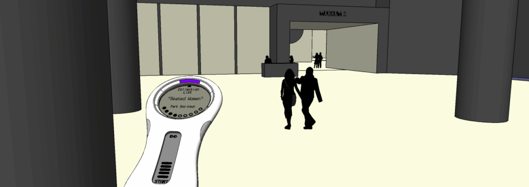 이 디지털 가이드는 원형의 투명 디스플레이를 특징으로 하며, 나침반과 유사한 방식의 내비게이션 안내에 적합한 형태를 갖는다. 또한 항공 분야에서 사용되는 HUD 인터페이스에서 영감을 받아, 선택한 작품을 정밀하게 타기팅할 수 있도록 한다.