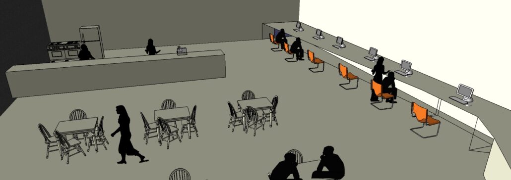 After completing their visit, Chris and his friend return the digital guides at the restoration booth.