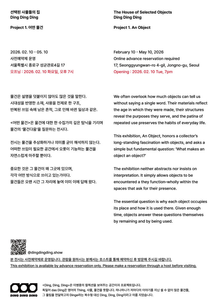 <Ding Ding Ding>은 이병종의 컬렉션을 보여주는 공간이자 프로젝트입니다. 독일어 das Ding은 영어의 Thing, 사물, 물건을 뜻합니다. 하나하나가 저마다의 이야기를 지닌 셀 수 없이 많은 물건들, 그 울림을 전달하고자 Dinge라는 복수형 대신 Ding, Ding, Ding이라고 이름 지었습니다.